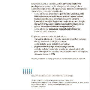 Prostorskim načrtovalcem pa bo pri delu v pomoč publikacija Priporočila za izdelavo krajinske zasnove, ki jo je v letu 2020 izdelal Urbanistični inštitut Republike Slovenije (UIRS) v sodelovanju z zunanjim izvajalcem Prostorsko načrtovanje Aleš Mlakar s.p. (Priporočila za izdelavo krajinske zasnove (2020); publikacija dosegljiva na spletnih straneh MOP: https://www.gov.si/assets/ministrstva/MOP/Dokumenti/OPN/priporocila_za_izdelavo_krajinske_zasnove.pdf)